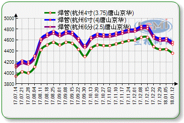 本周(1.8-1.12)杭州市场焊管4寸主流报价累降70。兰格钢铁云商平台监测数据显示:截止1月12日,杭州市场唐山京华新国标产6分(2.5mm)焊管主流报价4400元(吨价,下同),4寸(3.75mm)焊管报价4360元,6寸(4mm)焊管主流报价4560元。