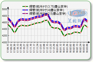 本周(2.27-3.2)杭州市场焊管4寸主流报价累降50。兰格钢铁云商平台监测数据显示:截止3月2日,杭州市场唐山京华新国标产6分(2.5mm)焊管主流报价4500元(吨价,下同),4寸(3.75mm)焊管报价4460元,6寸(4mm)焊管主流报价4660元。
