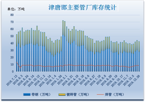 天津唐山邯郸主要管厂库存统计:本周(12.26)厂内原料带钢库存27.86万吨,比上周同期降2.38万吨,下降8.54%;焊管库存8.38万吨,比上周同期降0.17万吨,下降2.03%;镀锌管库存14.79万吨,比上周同期增0.69万吨,增长4.67%;各厂日均成交量3.755万吨,比上周同期降1.085万吨,下降28.89%。
