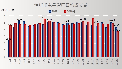 日均成交量:本周(12..26)管厂日均成交量3.755万吨,比上周同期降1.085万吨,下降28.89%;较上月环比减1.175万吨,下降31.29%;较去年同比减0.575万吨,下降13.30%。