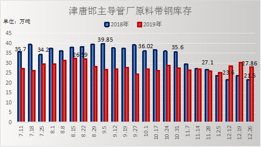 原料带钢:本周(12.26)厂内原料带钢库存27.86万吨,比上周同期降2.38万吨,下降8.54%;比上月环比增1.98万吨,增长7.11%;比去年同比增6.36万吨,增长29.58%。