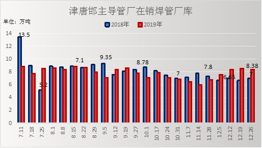 在销焊管:本周(12.26)厂内在销焊管库存8.38万吨,比上周同期降0.17万吨,下降2.03%;较上月环比增1.58万吨,增长18.85%;较去年同比增1.38万吨,增长19.71%。