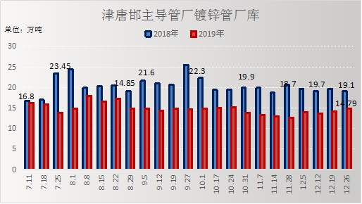 镀锌管:本周(12.26)厂内镀锌管库存14.79万吨,比上周同期增0.69万吨,增长4.67%;较上月环比增2.14万吨,增长14.47%;较去年同比减4.31万吨,下降22.57%。
