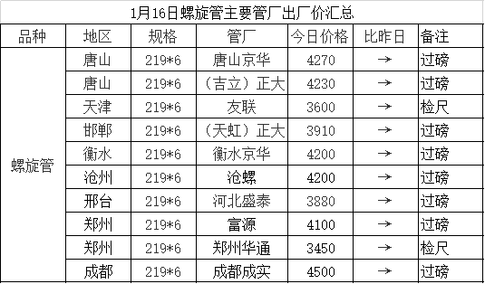 - 1月16日螺旋管主要管厂出厂价汇总2020-1-16