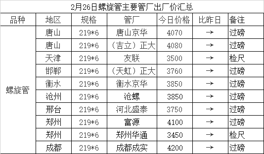 2月26日螺旋管主要管厂出厂价汇总