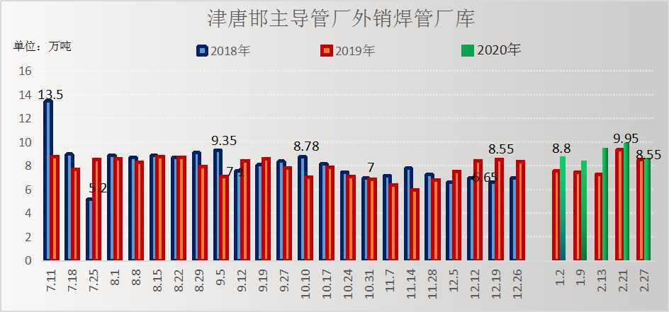 外销焊管:本周(2.27)焊管库存8.7万吨,比上周同期减1.25万吨,下降14.37%;比去年农历同期减0.85万吨,下降8.90%;