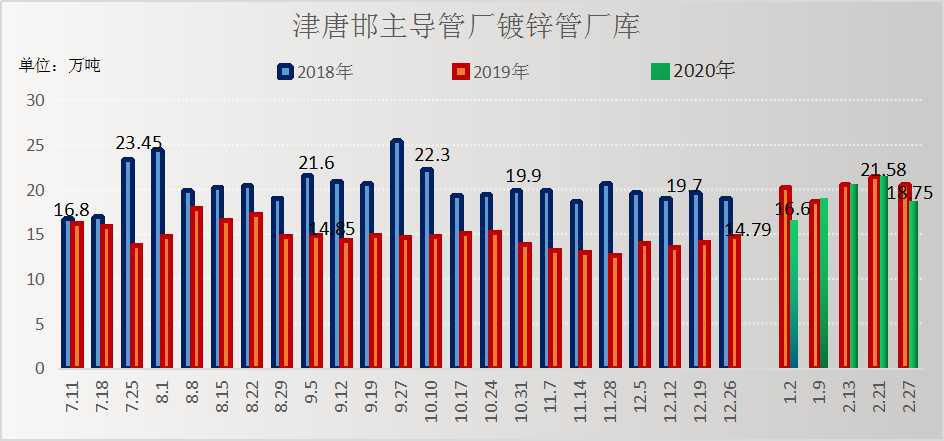 镀锌管:本周(2.27)镀锌管库存18.75万吨,比上周同期减2.83万吨,下降15.09%;比去年农历同期减0.65万吨,下降3.35%;
