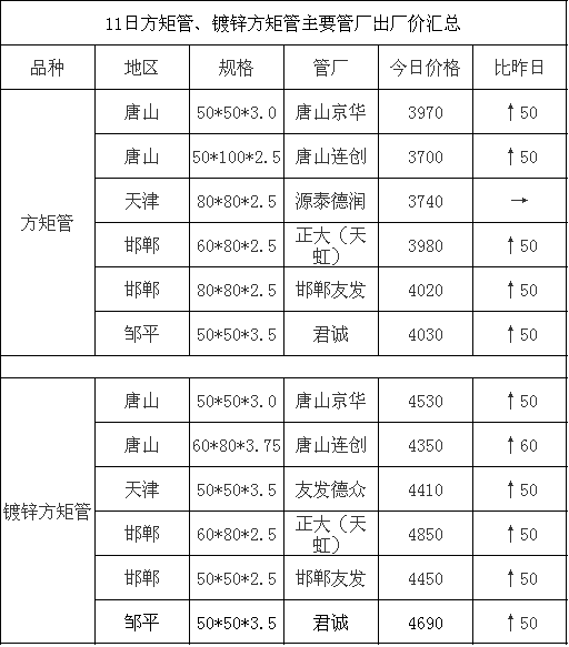 3月11日方矩管、镀锌方矩管主要管厂出厂价汇总