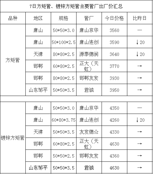 7日方矩管、镀锌方矩管主要管厂出厂价汇总