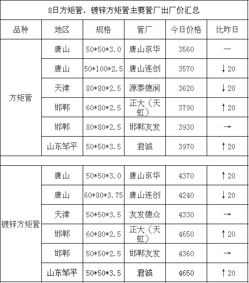 8日方矩管、镀锌方矩管主要管厂出厂价汇总