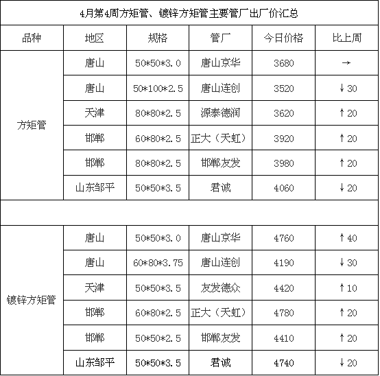 4月第4周方矩管、镀锌方矩管主要管厂出厂价汇总
