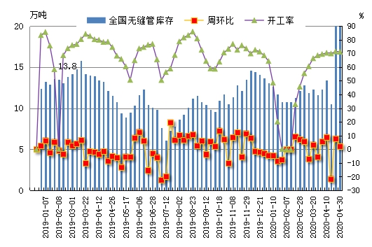 导语:五一节前的最后一周,国内钢市整体在小区间内震荡下行,周后期建材、型材品种小幅反弹,但未引起涟漪出现,国内无缝管市场本周整体趋下为主,跌幅在30-70元不等。国内疫情“外防内控”尾声,零星病例将是常态化,国内复产、复工基本达到去年同期水平,两会确定将于5月22日召开,国内经济全年基调、调整等将尘埃落定,给予市场一颗定心丸。