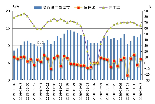 截至5月15日:山东地区125条(含8条连轧机组)开工率69.9%,较上周(5.8)下降0.5个百分点。临沂地区65条生产线(含1条连轧机组)开工率64.8%,较上周下降0.6个百分点。临沂地区7家管厂总库存13.2万吨,较上周增加0.8万吨,周环比增长6.45%。