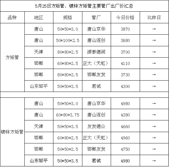 5月25日方矩管、镀锌方矩管主要管厂出厂价汇总