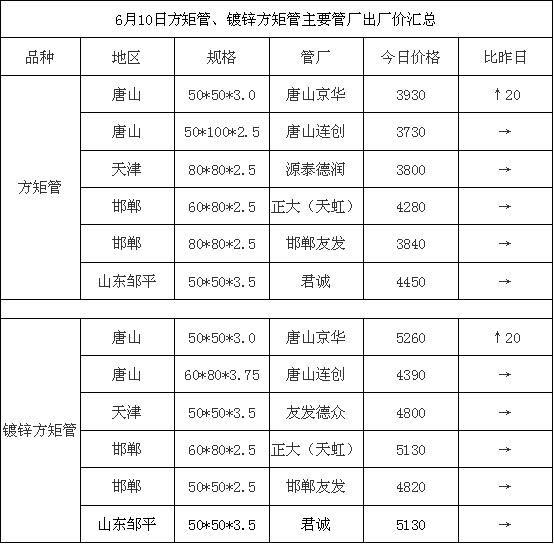 6月10日方矩管、镀锌方矩管主要管厂出厂价汇总