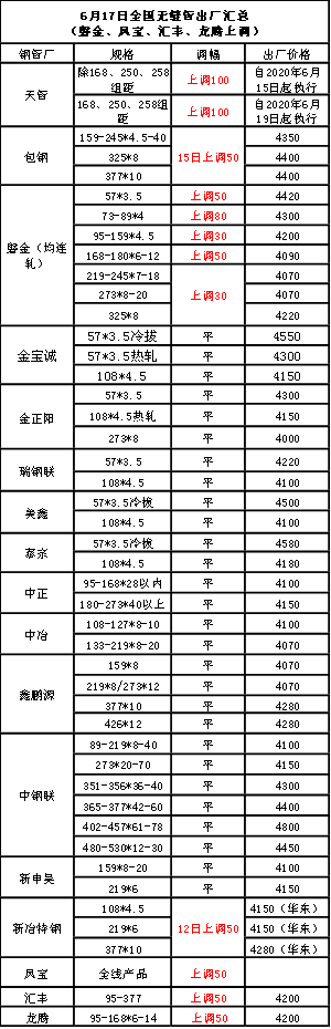 6月17日全国无缝管出厂汇总(磐金、凤宝、汇丰、龙腾上调)