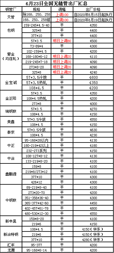 6月23日全国无缝管出厂汇总(磐金明日上调20-80)