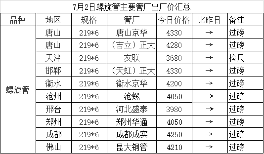 6月29日螺旋管主要管厂出厂价汇总(个别上调20)