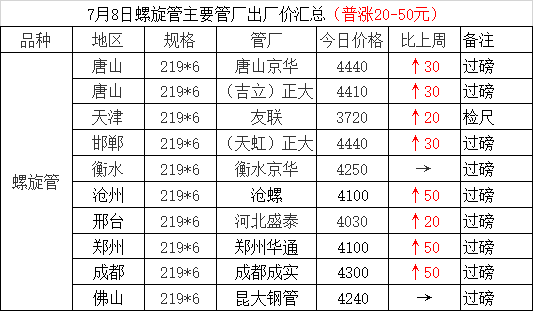7月8日螺旋管主要管厂出厂价汇总(普涨20-50元 )
