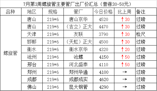 7月第3周螺旋管主要管厂出厂价汇总(普涨30-50元)