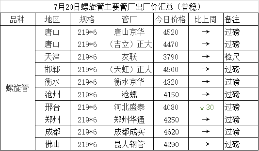 7月20日螺旋管主要管厂出厂价汇总(普稳)