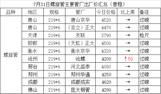 7月21日螺旋管主要管厂出厂价汇总(普稳)