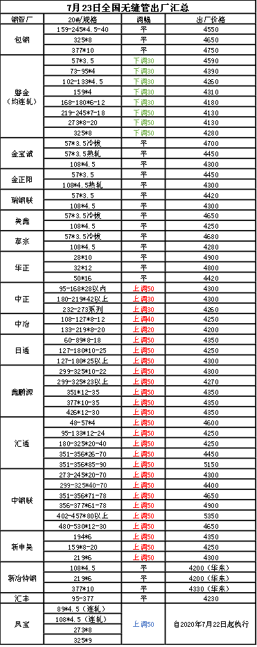 7月23日全国无缝管出厂汇总(聊城地区上调20-50)