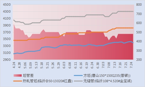 截至7月27日,唐山方坯Q235(普碳)150*150价格3390元,与上个交易日相比下调10元。山东地区20#热轧管坯出厂价格潍钢、江鑫、鲁丽分别为3900元、3820元和3840元。其中江鑫管坯两条棒线,其中中棒线今日起会有4-5天产45#钢,管坯资源整体仍偏紧张。今日管坯价格暂稳,以临沂地区江鑫和金宝城相比,管厂、管坯价差480元,环比上周价差未变。经过前期的一轮拉涨,本周初始开始进入平稳阶段。