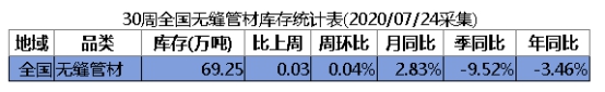 截至7月27日本周无缝管全国23个主导城市社会总库存69.25万吨,同比上周增加0.03万吨,较上周同期上升0.04%,较上月同期上升2.83%,较上个季度同期相比下降9.52%,较去年同期相比下降3.46%。