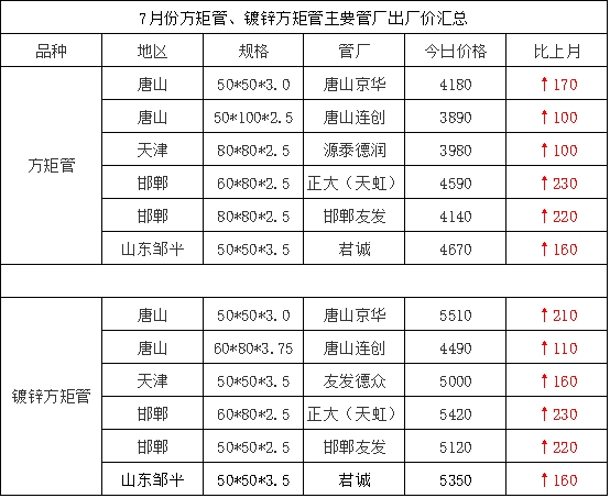 7月份方矩管、镀锌方矩管主要管厂出厂价汇总(累计上调100-230)