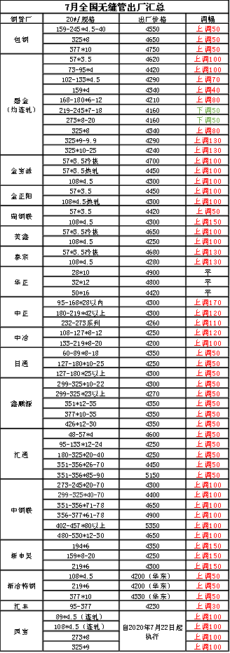 7月23日全国无缝管出厂汇总(聊城地区上调20-50)