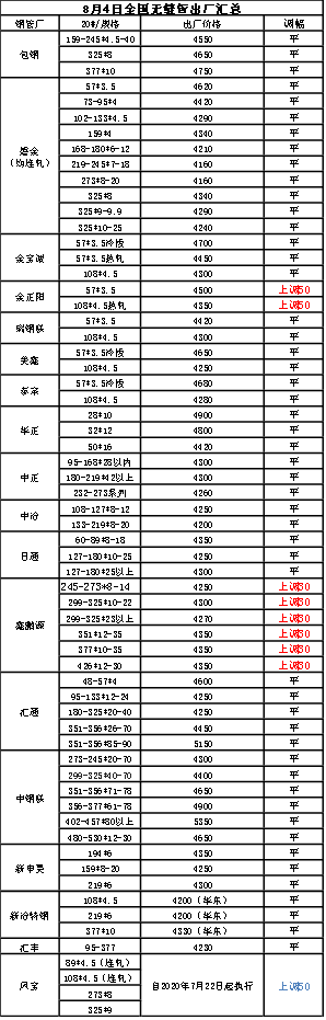 8月4日全国无缝管出厂汇总(山东部分上调,其他欲跟进)