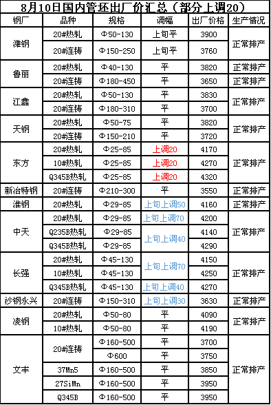 8月10日全国无缝管出厂汇总(磐金上调20-50)