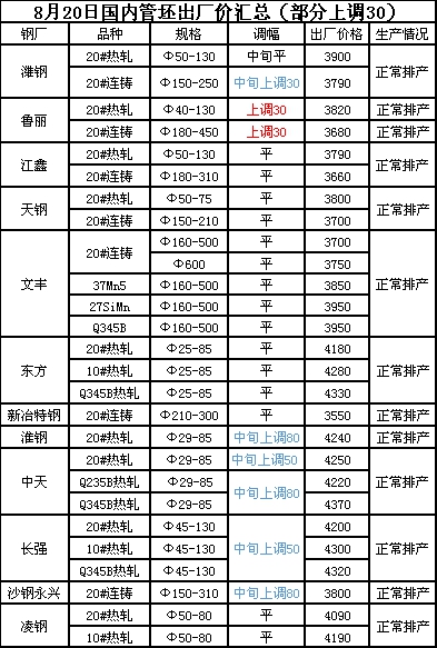 - 8月20日全国无缝管出厂汇总(部分下调30)2020-8-20