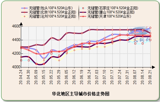 截至本周8月21日华北地区北京、沧州、唐山、石家庄、包头、天津108*4.5mm市场价格分别为4500元、4400元、4420元、4400元、4500元、4450元。本周华北地区受雨季影响价格主稳运行,个别地区贸易商降库优惠出货。整体华北地区贸易商还是多以保守操作。