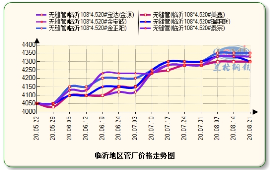截至8月21日无缝管厂家临沂地区108*4.5金正阳4350元,金宝诚4350元,瑞钢联4300元,泰宗4330元,美鑫4300元。其中金正阳连轧机组检修至8月底或9月初。本周临沂地区厂家持稳,管厂现处跌涨两难境界,受管坯价格上涨影响成本压力进一步加大,但是无缝管市场需求不为乐观,贸易商拿货较少,故此涨价空间不足。