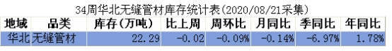 截至8月21日本周无缝管华北地区社会总库存22.29万吨,同比上周减少0.02万吨,较上周同期下降0.09%,较上月同期减少0.14%,较上个季度同期相比下降6.97%,较去年同期相比上升1.78%。