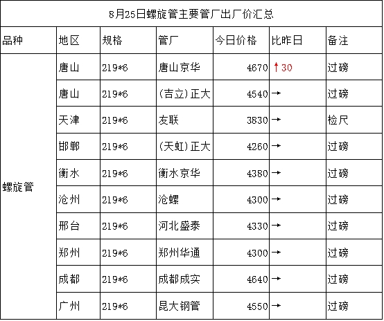 8月25日螺旋管主要管厂出厂价汇总(唐山京华上调30)
