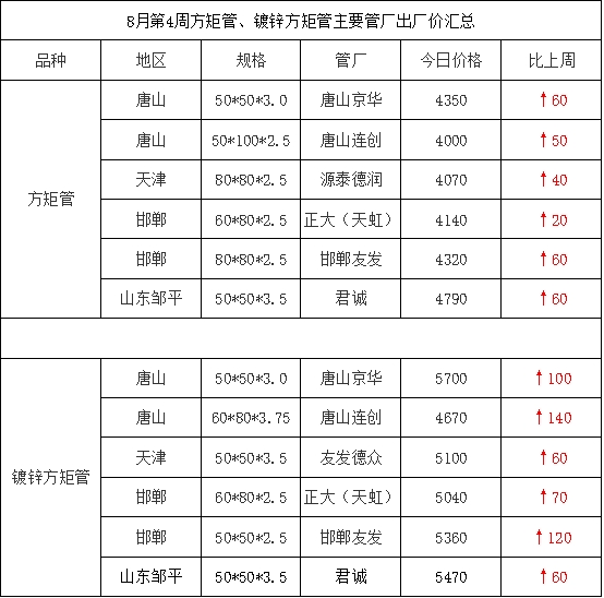 8月第4周方矩管、镀锌方矩管主要管厂出厂价汇总(上调20-140)