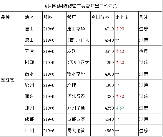 8月27日螺旋管主要管厂出厂价汇总(唐山京华上调20)