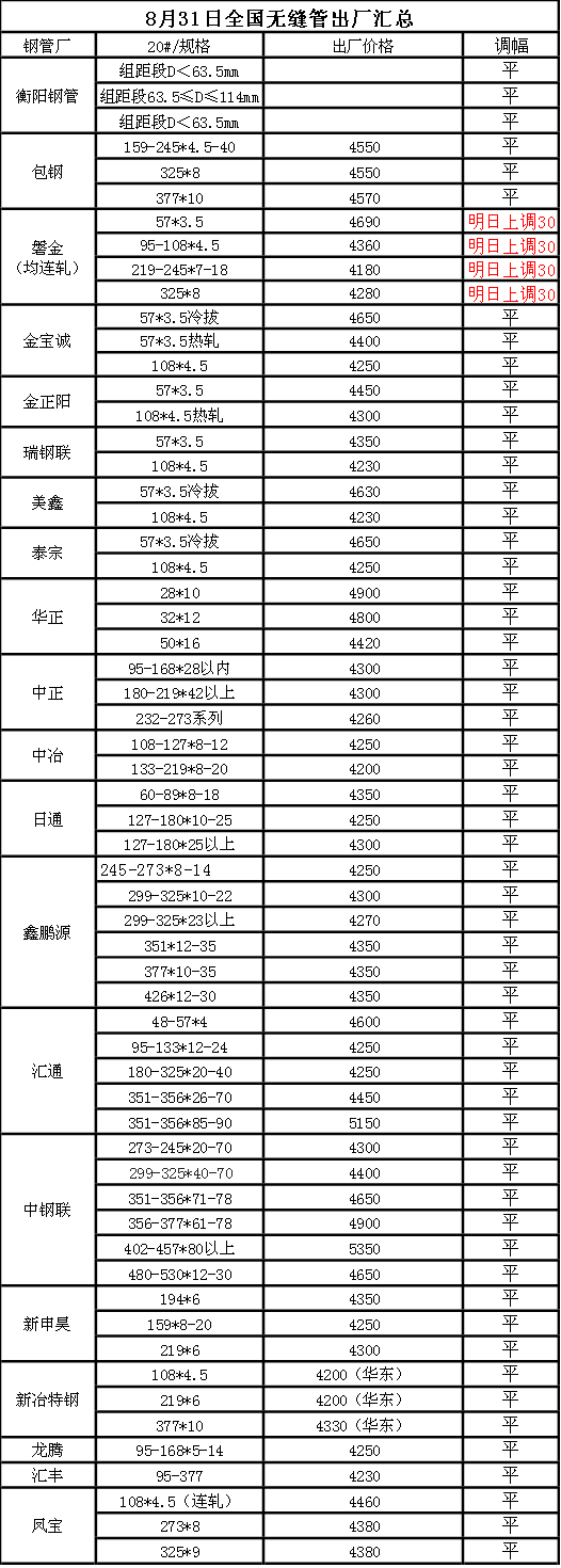 8月31日全国无缝管出厂汇总(磐金明日上调30)