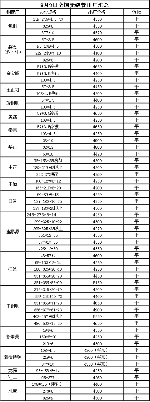 9月1日全国无缝管出厂汇总(磐金、汇丰上调30)