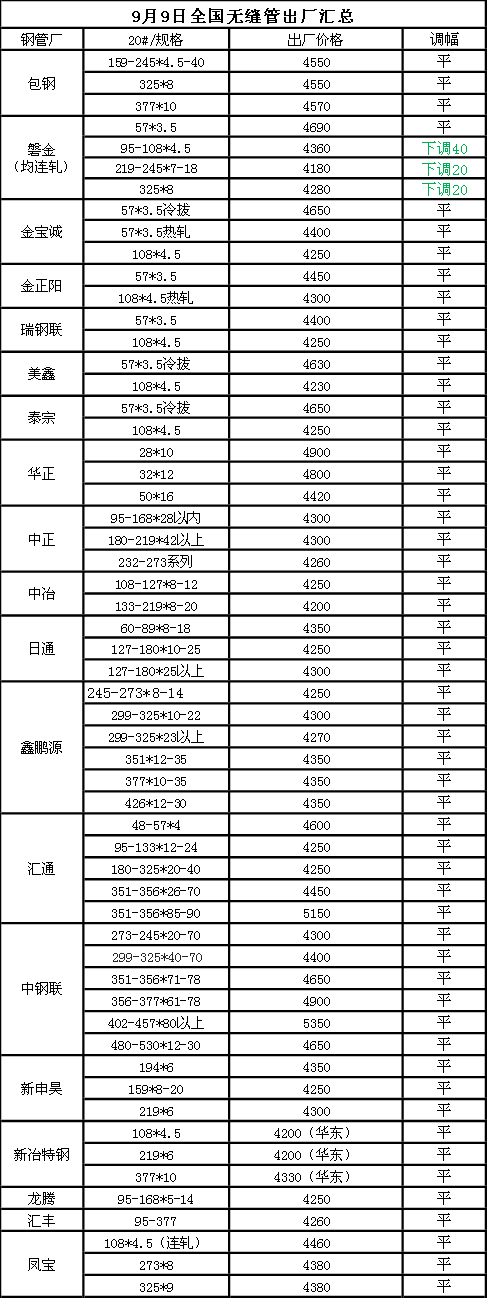 9月9日全国无缝管出厂汇总(磐金部分规格下调20-40)