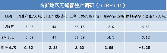临沂地区7家管厂9月4日-9月11日周总产量为3.09万吨,较上周同期增加0.01万吨,周环比增长0.32%;开工产线共44条,较上周同期增加1条,周环比增长2.33%。原料管坯库存为6.12万吨,较上周同期增加0.55万吨,周环比下降8.25%。9月10日金正阳检修结束,开工率小幅上升,产能释放和高库存的矛盾进一步激化,管厂库存持续小幅上升。
