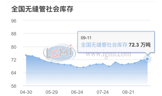 截至9月11日,全国23个主导地区无缝管社会总库存为72.3万吨,同比上周增加0.82万吨,周环比增长1.14%。连续四周库存增长。管厂开工率的不断释放,市场需求并未明显提振,社会库存持续走高。