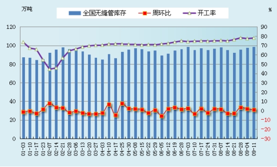 据兰格钢铁对样本企业调研无缝管生产情况,截至9月11日:全国200条(含长流程钢管厂40条)生产线开工率78.1%,较上周(9月4日)增长0.6个百分点。总库存98.4万吨,较上周增加0.8万吨,周环比增长0.82%。连续三周库存增加。