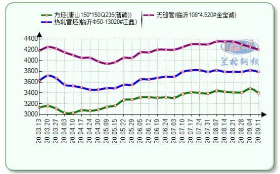 截至9月4日,唐山方坯Q235(普碳)150*150价格3400元,本月累跌80元,本周方坯价格周初冲高后周中小幅回调。