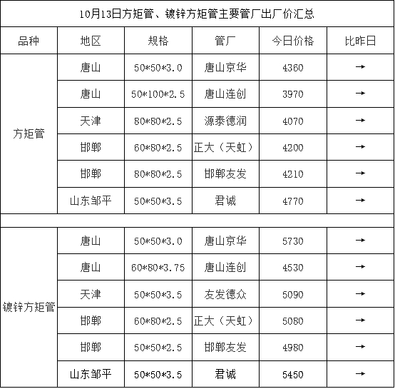 10月13日方矩管、镀锌方矩管主要管厂出厂价汇总