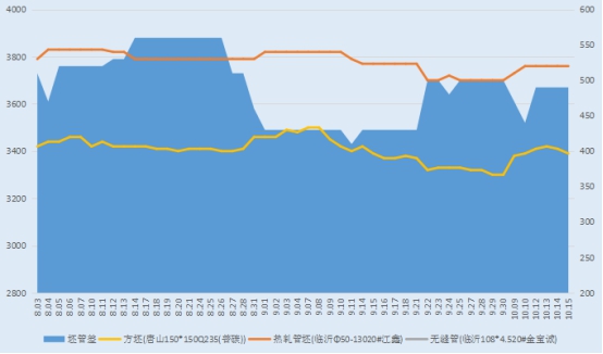 今日(10.15),唐山地区方坯(150*150 Q235普碳)出厂价为3390元,较上个交易日下调20元。临沂江鑫20#热轧管坯出厂价格3760元,与上个交易日持平。临沂金宝诚管厂108*4.5mm出厂价格4250元,坯管差490元。