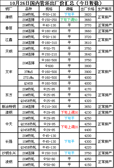 10月26日国内管坯出厂价汇总(今日暂稳)